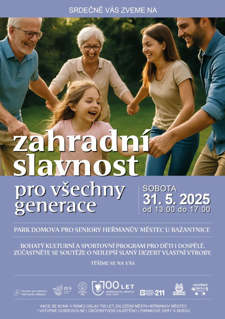 Domov pro seniory Heřmanův Městec, Mateřská škola Jiráskova H.M., ZUŠ Heřmanův Městec, SPOKUL HM a Město Heřmanův Měsec Vás zvou na Zahradní slavnost pro všechny generace.